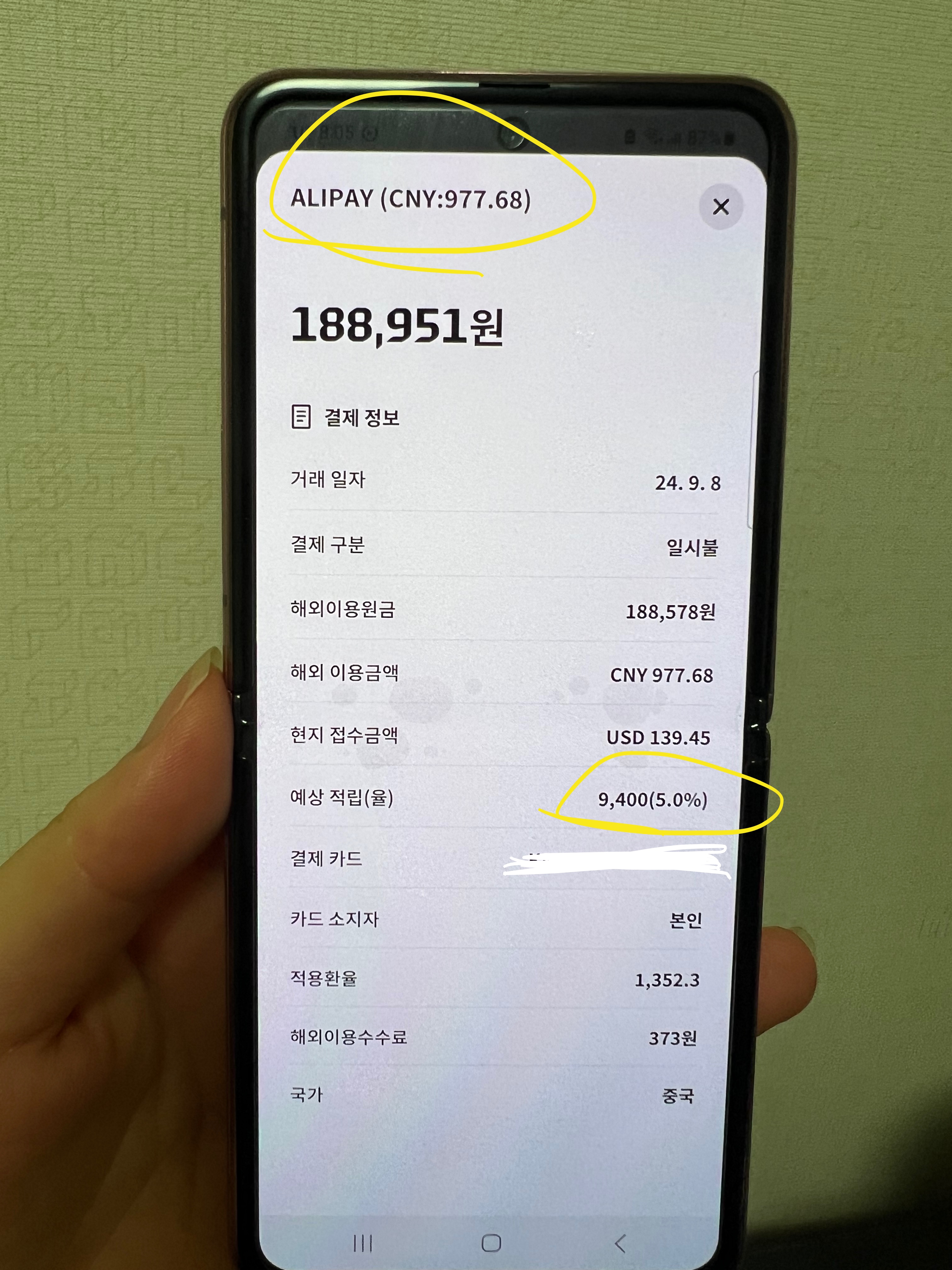 제가 사용하는 카드는 해외결제 건에 대하여 5% 포인트 적립을 도와주는 카드입니다. 국내결제 건은 1% 적립인데, 해외결제에서 혜택을 굉장히 많이 주더라고요 그래서 해외결제가 많지는 않지만 포인트 적립을 받는 금액이, 해외결제 수수료를 내는 것보다 더 이익이라 생각하여 알리페이를 이용한 해외결제를 진행하고 있습니다.
