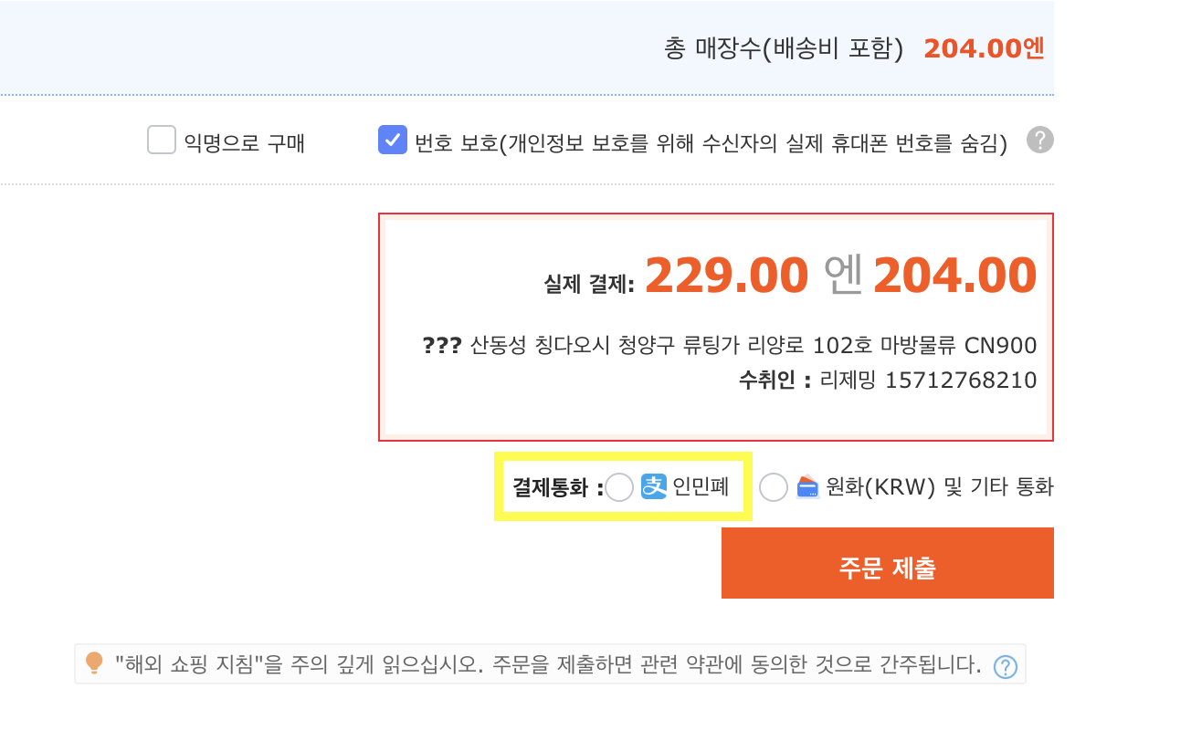 1. 상품 결제하기 - 결제통화 - 알리페이 모양 클릭 (인민폐)