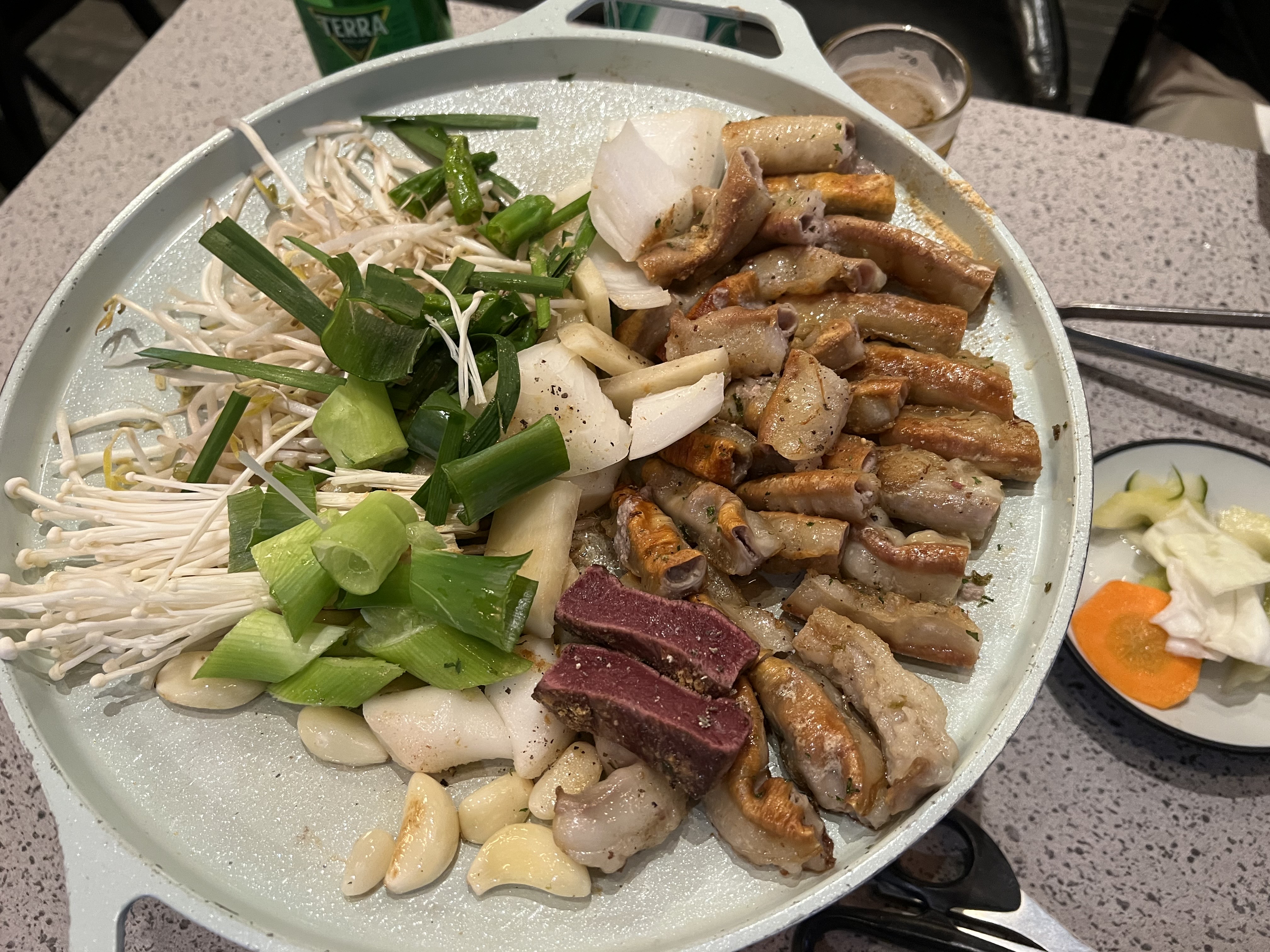 생각보다 '곱'이 많지 않았다. 그 곱이 구워져서 꼬소하게 씹히는 그런맛이 아니라 곱은 거의없고, 기름진 곱창부위가 쫄깃쫄깃하게 씹히는 곱창이었다. 나는 곱창에 곱이 꼬소하게 많은걸 좋아하는데, 그런 식감은 아니어서 아쉬웠다. 다만 엄청 깔끔하고 세련되고 되게 젊은 사람들도 와서 분위기 타면서 먹을수 있는 트랜디한 곱창집 느낌이었다.
