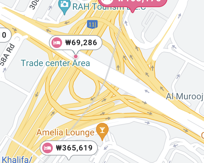 - 두 번째 이유는 '두바이 도로' 상황이 한국과 달랐다는 점이다. 두짓타니 호텔 앞은 '원웨이' 도로다. 지도에서 보면 두바이몰과 차로 이동 시에 바로 코앞이겠다 생각했지만, 두바이 도로는 한국처럼 유턴지점이 많지 않고 '직선' 중심 도로라 골목골목 길을 뚫고 가기도 여의치 않다. 그래서 코 앞에 있는 두바이몰에 가겠다고 차를 타면 빙- 돌아서 가야 하기 때문에, 차라리 거리상 조금 떨어져 있는 호텔이 택시요금이 덜 나왔을 거라 생각된다.